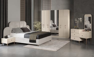 Lora Yatak Odası Takımı, kum bejinin yumuşak tonlarıyla yaşam alanınıza sakinlik, konfor ve zarafet getirir.