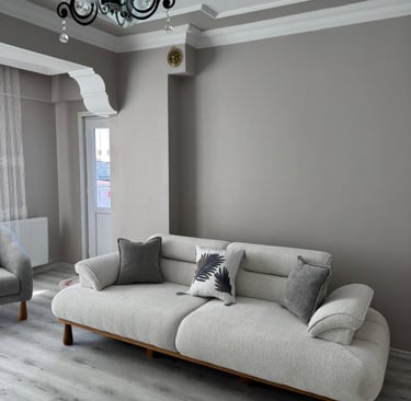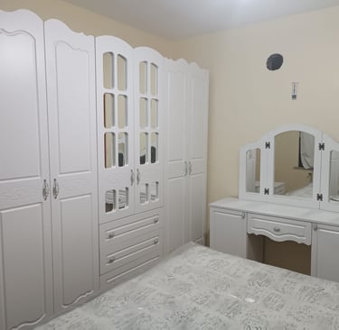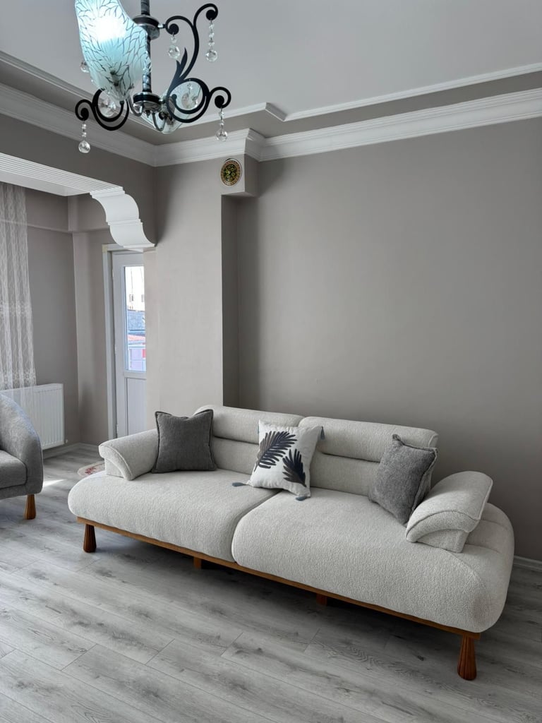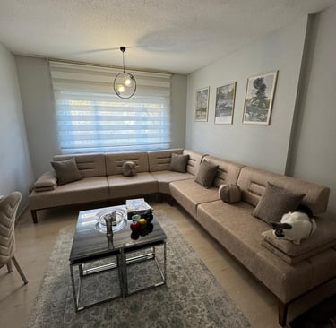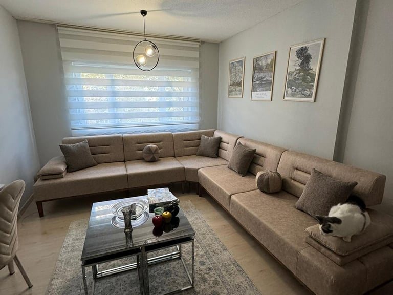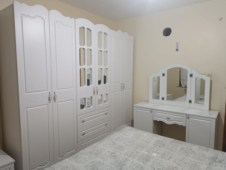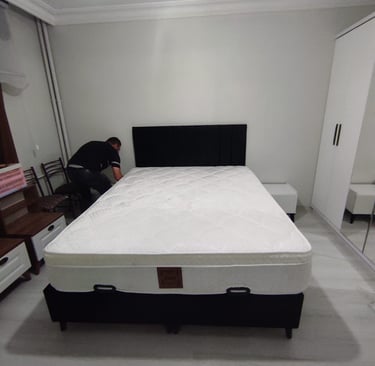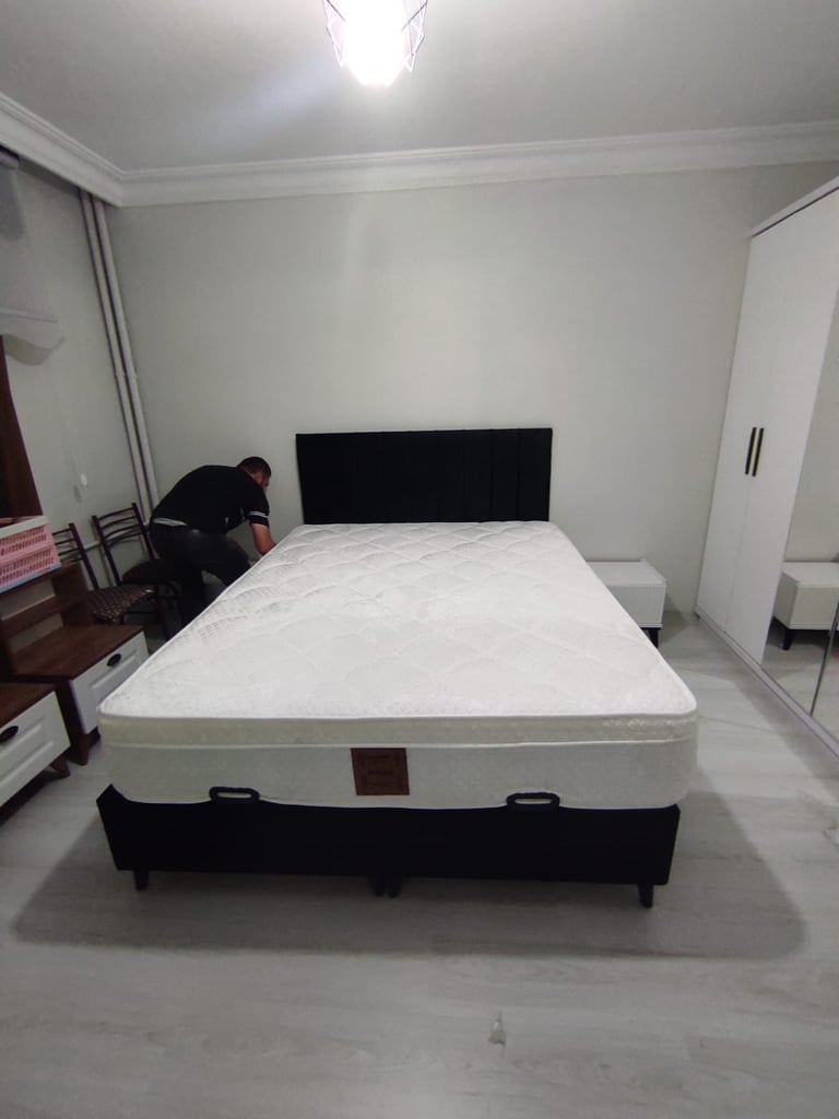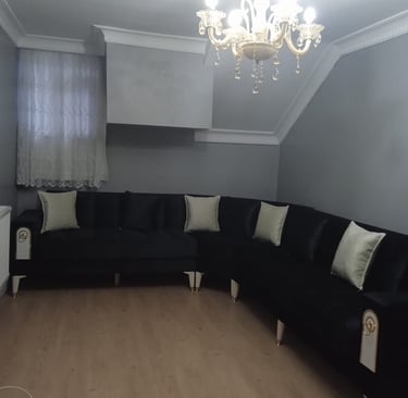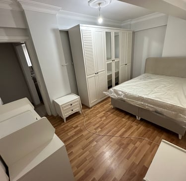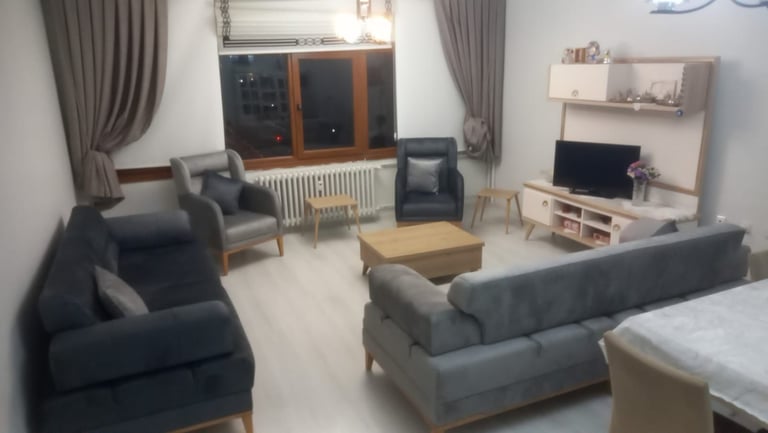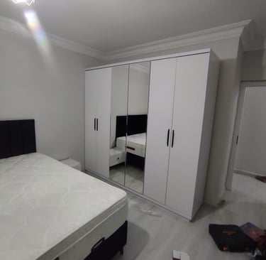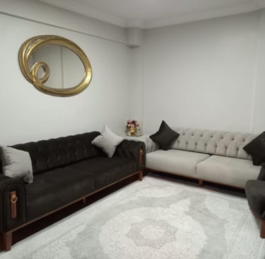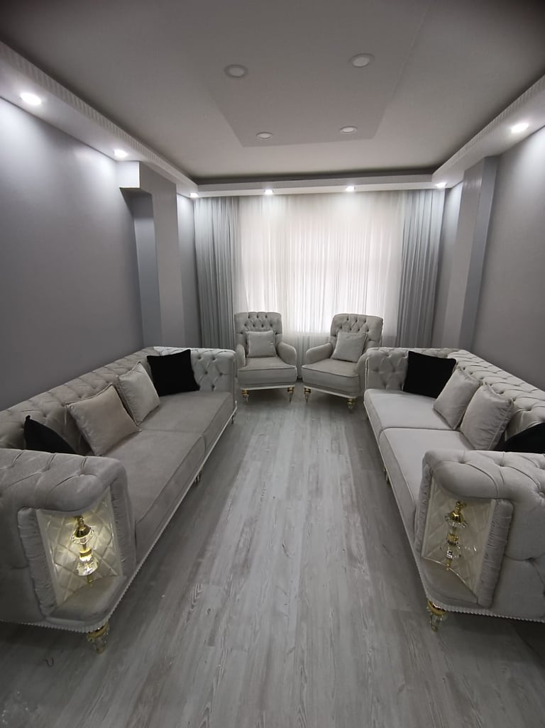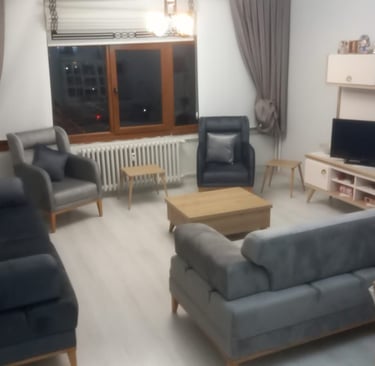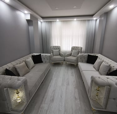 Yatak odası, koltuk takımı, masa ve sandalye.