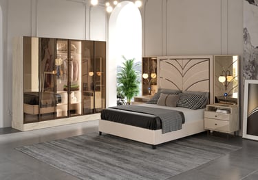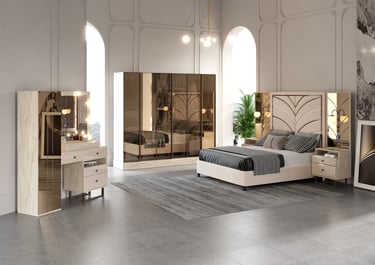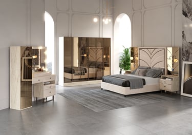 Santos Yatak Odası Takımı, modern çizgileriyle doğal dokuları ustaca birleştirerek yatak odalarına sıcak, şık ve sofistike bir atmosfer kazandırıyor. Bej ve mermer tonlarının zarif uyumu, bronz ayna detaylarıyla birleşerek mekâna göz alıcı bir derinlik katıyor.