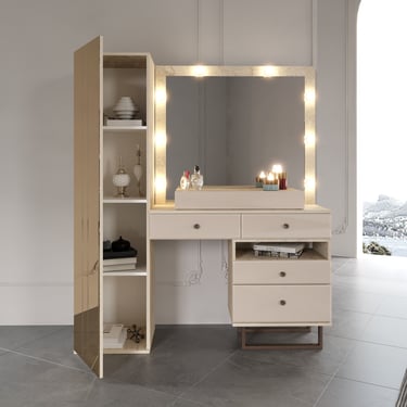 Doğal mermer desenli yüzeye sahip makyaj masası ve aydınlatmalı ayna